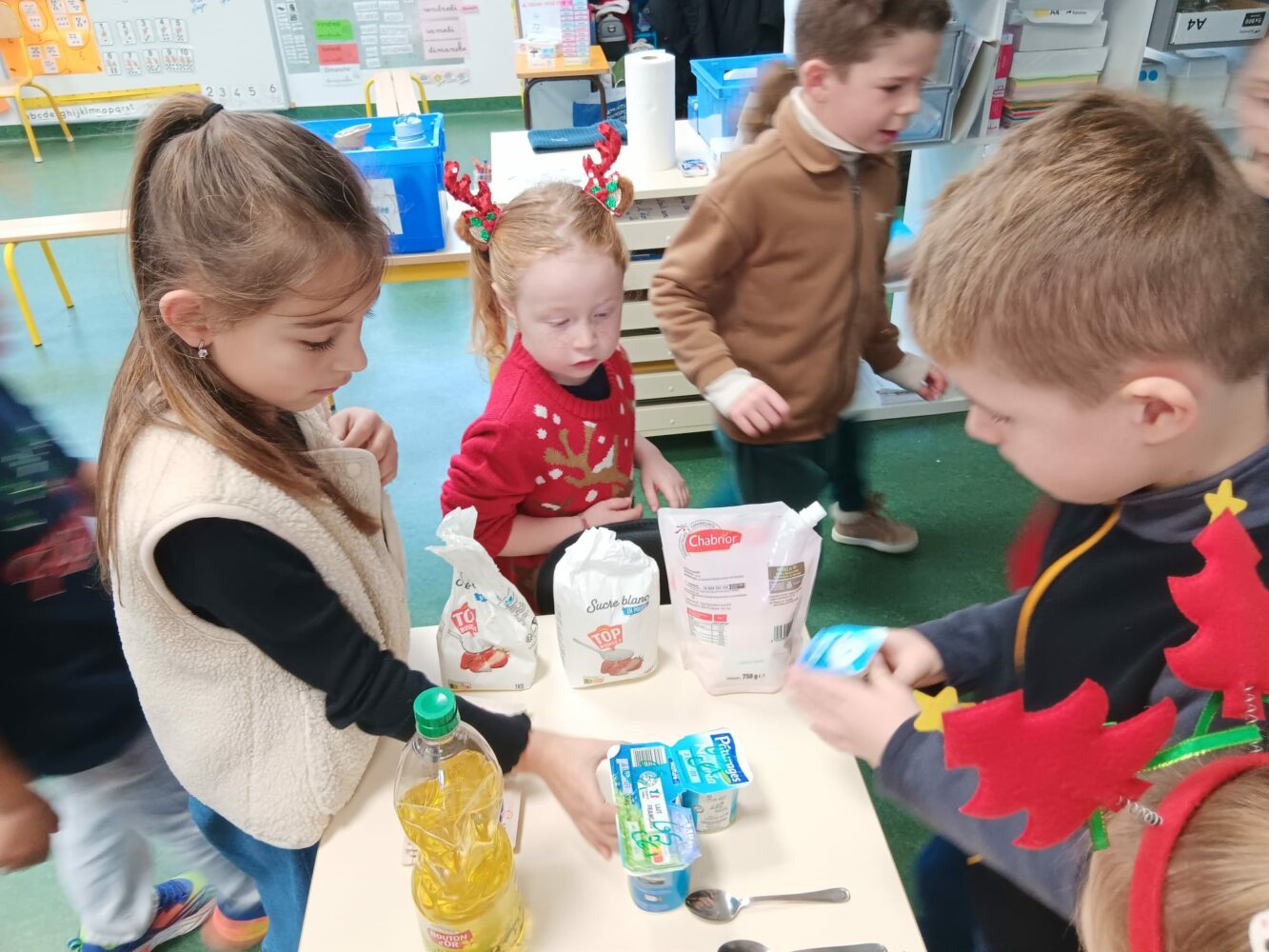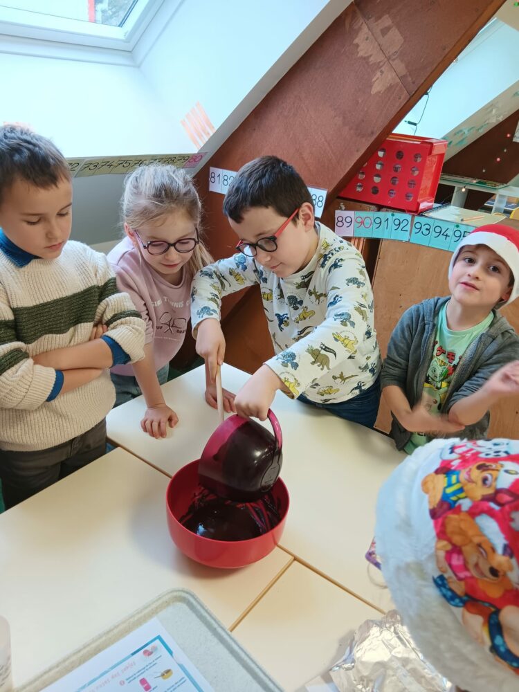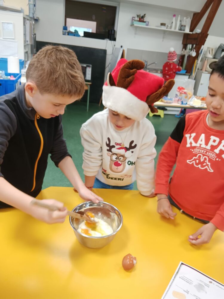 Ils ont échangé les classes pour faire un bricolage: une très belle guirlande, et de la cuisine: des roses des sables et des gâteaux en au yaourt en forme de bonhomme de neige et d’étoile filante.